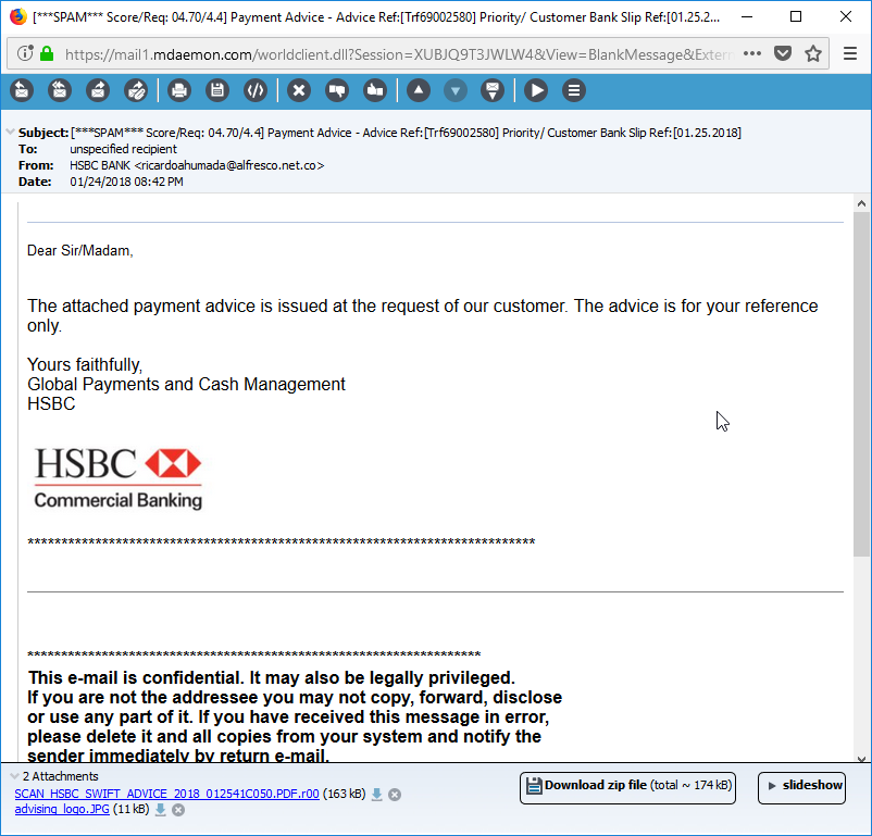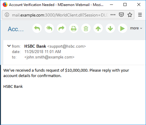 Here is an example that has been spoofed to look like it was sent from HSBC Bank:
