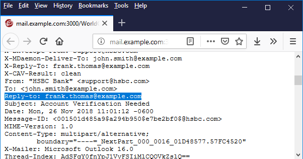 A quick examination of the message headers reveals a return-path address that is not associated with the From address. A reply to this message would go to frank.thomas@example.com.
